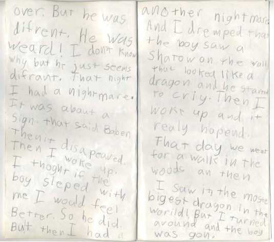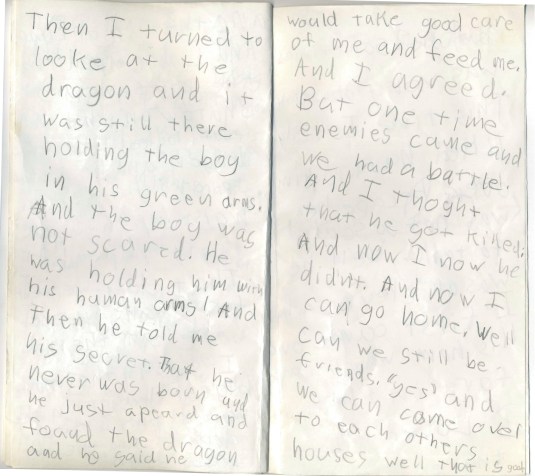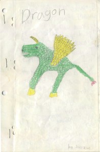 This is the part where I’m supposed to talk about myself in the third person. Instead, I have decided to provide you with my very first storytelling effort, as promised. I haven’t changed all that much since I wrote Dragon, although I hope my writing is better, and I no longer think inviting “weard” men to stay over at my house so I can help alleviate their “sarowniss” is a good idea.
